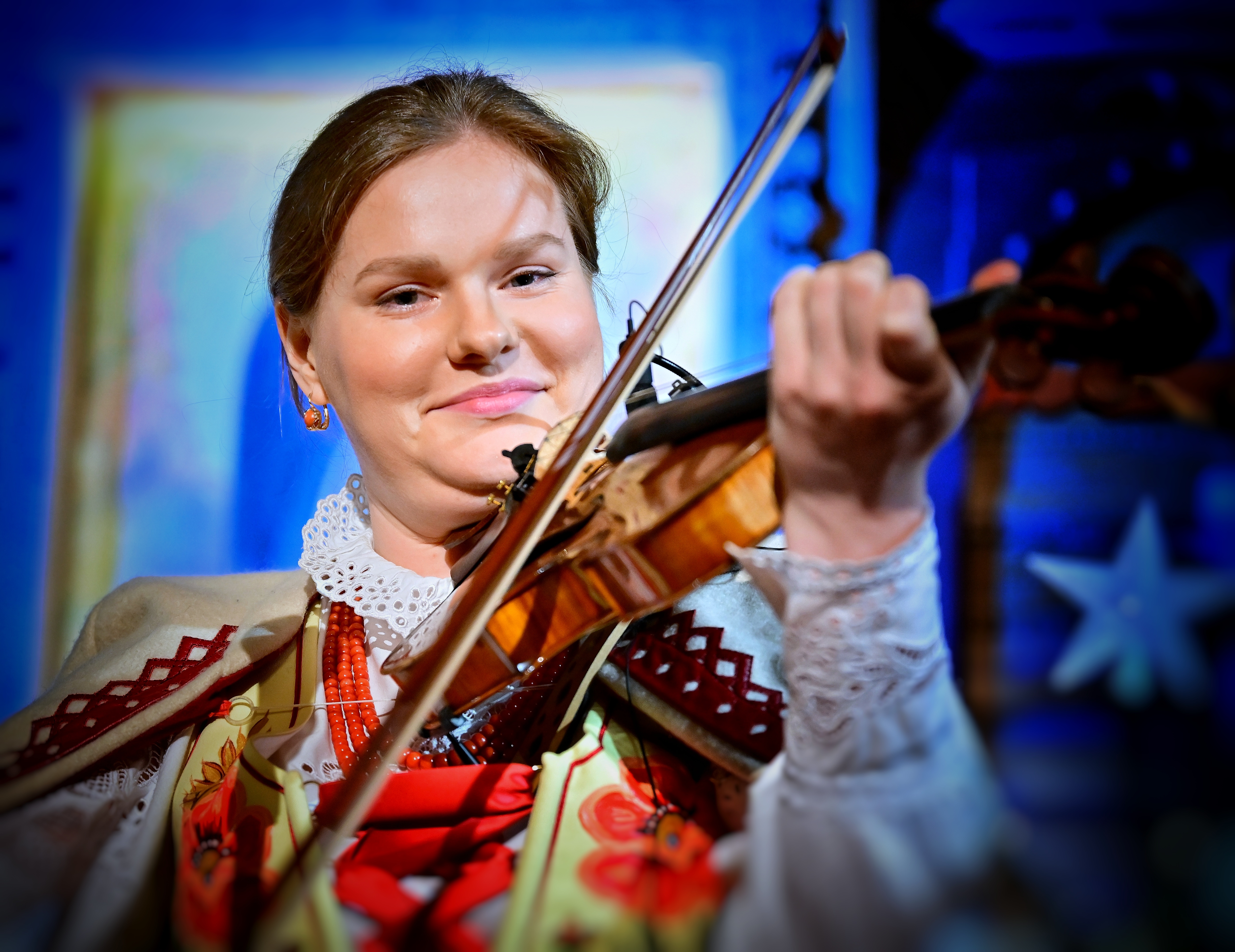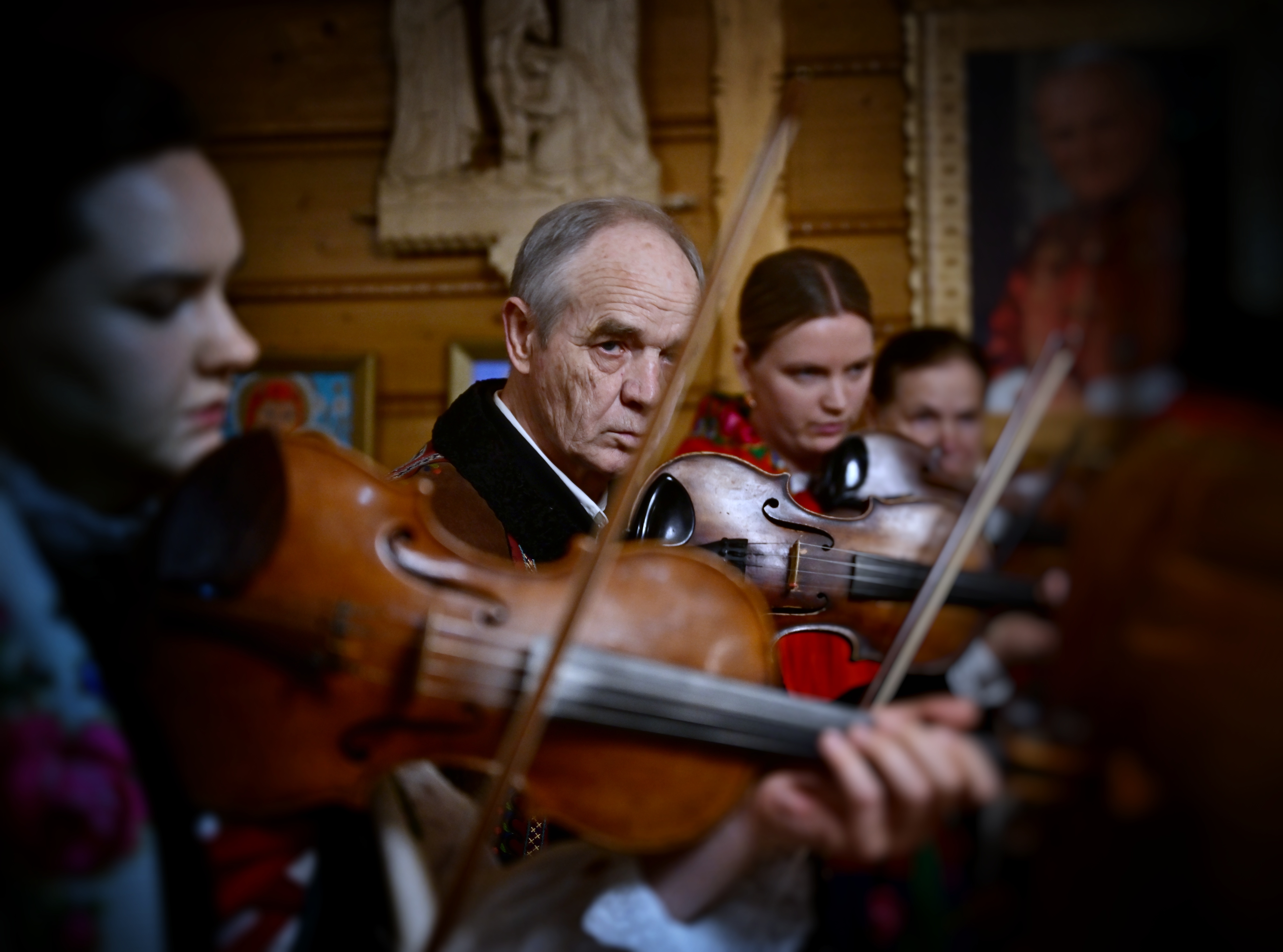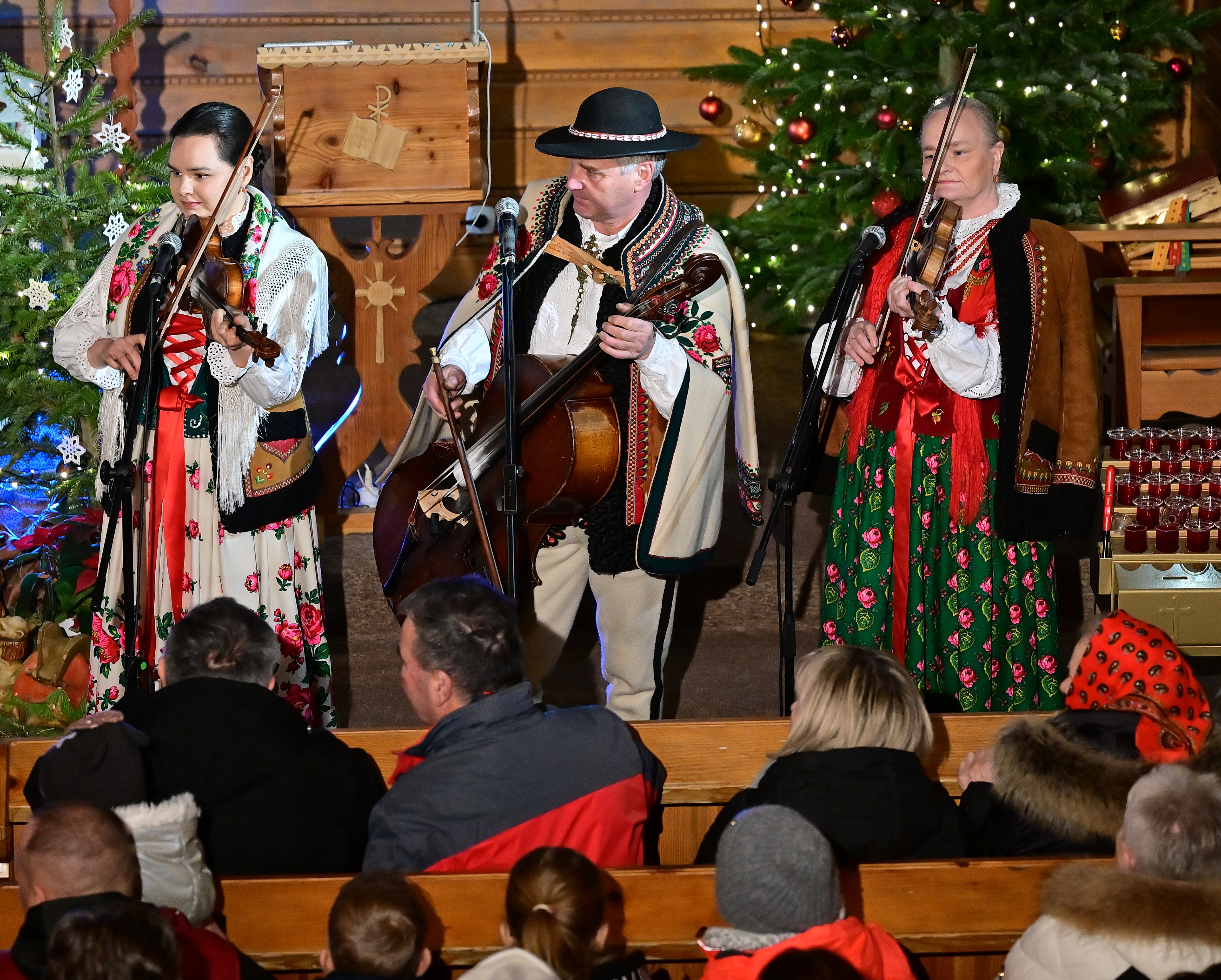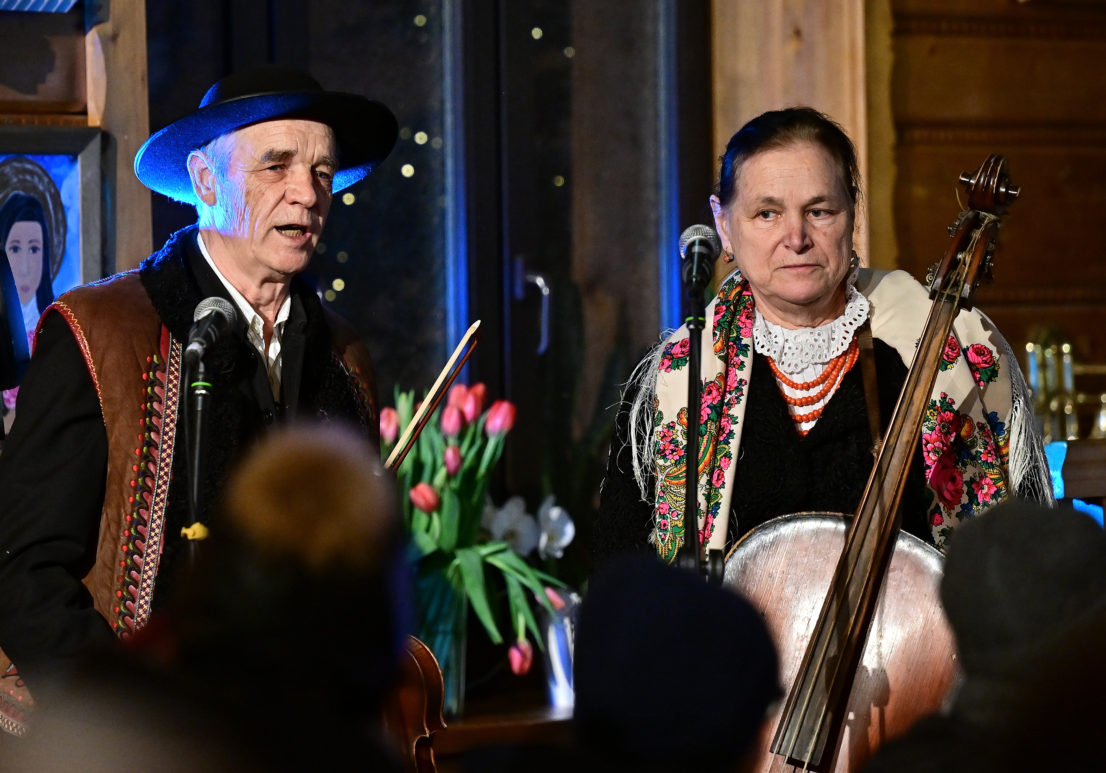 tradycyjną muzyką góralską zagraną na gęślach, basach podhalańskich,